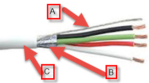 Global recommends using 18 guage, Stranded, Shielded with a drain wire as shown below for power and data. The example below shows a 4 conductor which can be used to carry both 18VDC power to devices as well as data to each device.